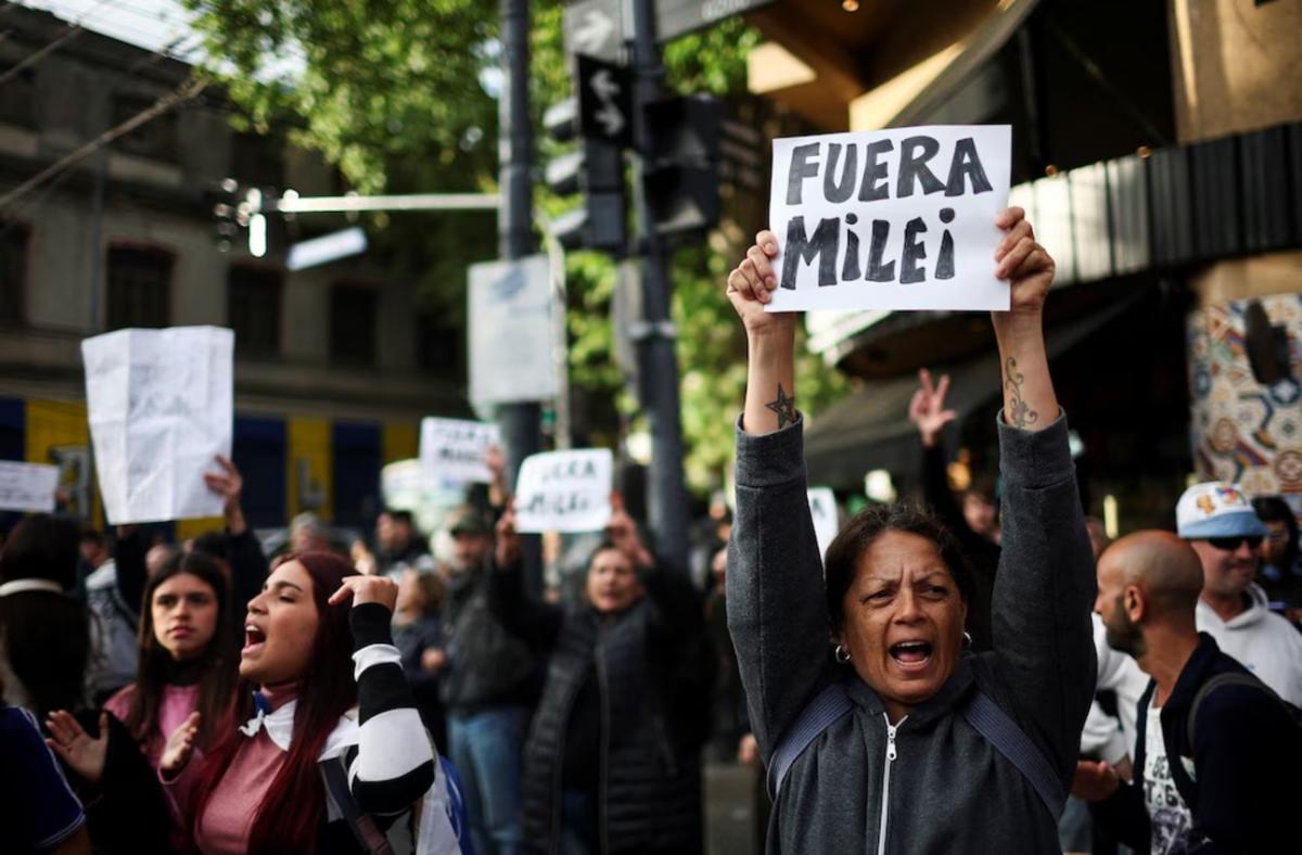 INCIDENTES. Mientras el presidente Javier Milei se preparaba para presentar su nuevo libro, “La Construcción del Milagro”, en el estadio Movistar Arena, manifestantes se enfrentaron con la policía en las afueras del predio. REUTERS