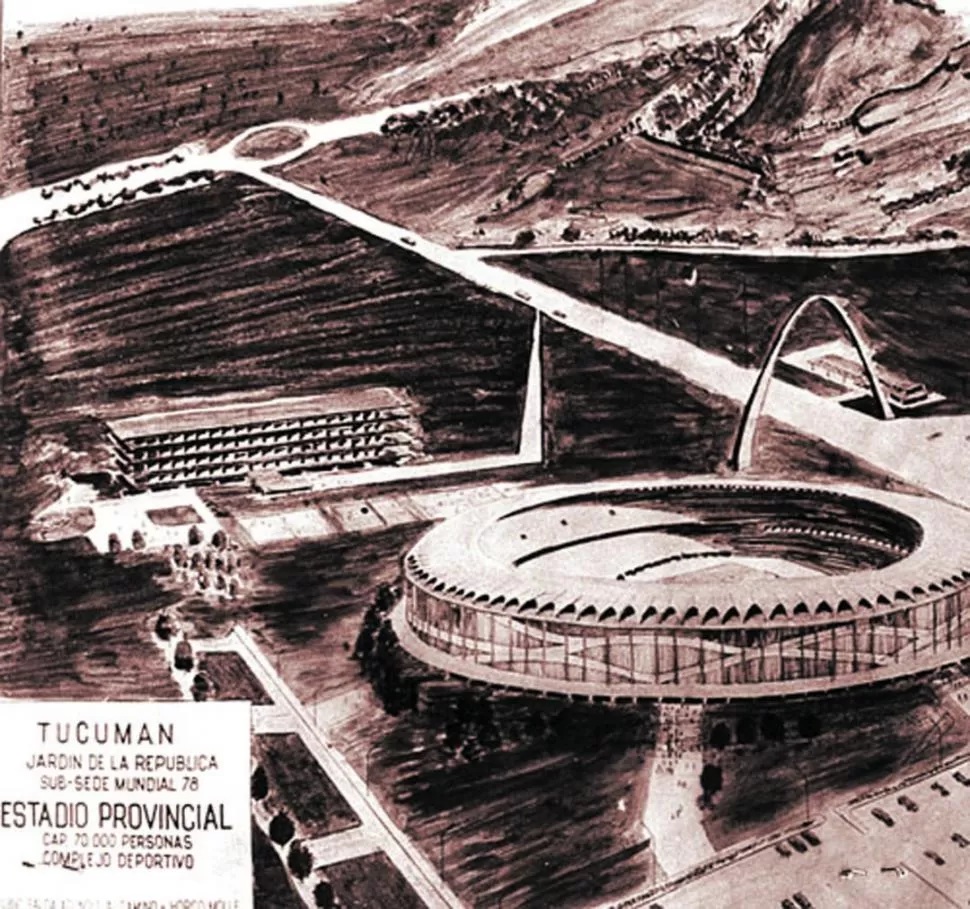 El estadio se pensó a lo grande, a imagen y semejanza del Busch Memorial de Saint Louis (EEUU), hogar beisbolístico de los Cardinals hasta su demolición en 2005. Inspirado en el paisaje de los cerros, tendría capacidad para 70.000 espectadores y formaría parte de un complejo dotado con edificios anexos, 10.000 plazas de estacionamiento y restaurantes. La imagen que acompaña al texto es una de las pocas que quedaron del proyecto y lo que se ve es un estadio muy parecido al de Racing. Lo cierto es que las obras comenzaron con el movimiento de suelos en Horco Molle; fue así que durante mucho tiempo se apreció con nitidez en la zona un gigantesco cráter. Allí debía volcarse el cemento para unos cimientos que jamás vieron la luz.