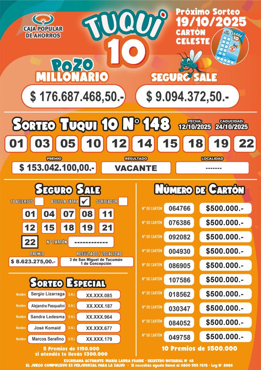 Otro domingo más en el que se realizó el Tuqui 10, el reconocido sorteo de la Caja Popular de Ahorros que se transmite a través de Canal 10. Por esta ocasión se encontraba en juego un pozo millonario de $153.042.100 y otros premios como el Seguro Sale, Número de Cartón y el Sorteo Especial.