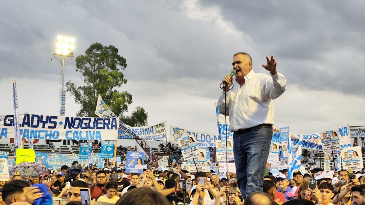 El gobernador en uso de licencia y candidato a diputado Osvaldo Jaldo habla en el Club San Antonio de Ranchillos, mientras cae una llovizna. Agradece el masivo acompañamiento y afirma que hay gente que se quedó sin lugar para entrar. "Faltan menos de 10 días para ese gran momento donde Tucumán tiene la gran responsabilidad de poner ese voto de confianza y de unidad para todos los tucumanos y tucumanas. Por eso hoy tenemos que asumir el compromiso que el 26 de octubre vamos a llenar las urnas de votos peronistas".