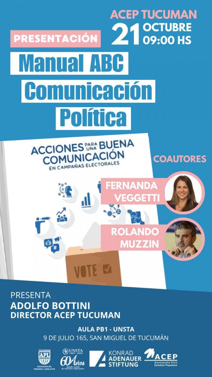 Este martes 21 de octubre, a las 9:00 horas, se presentará en la Universidad del Norte Santo Tomás de Aquino (UNSTA) la nueva edición del “Manual ABC de la Comunicación Política, las Campañas y las Elecciones”, una obra que reúne herramientas clave para comprender y gestionar procesos de comunicación política contemporánea.