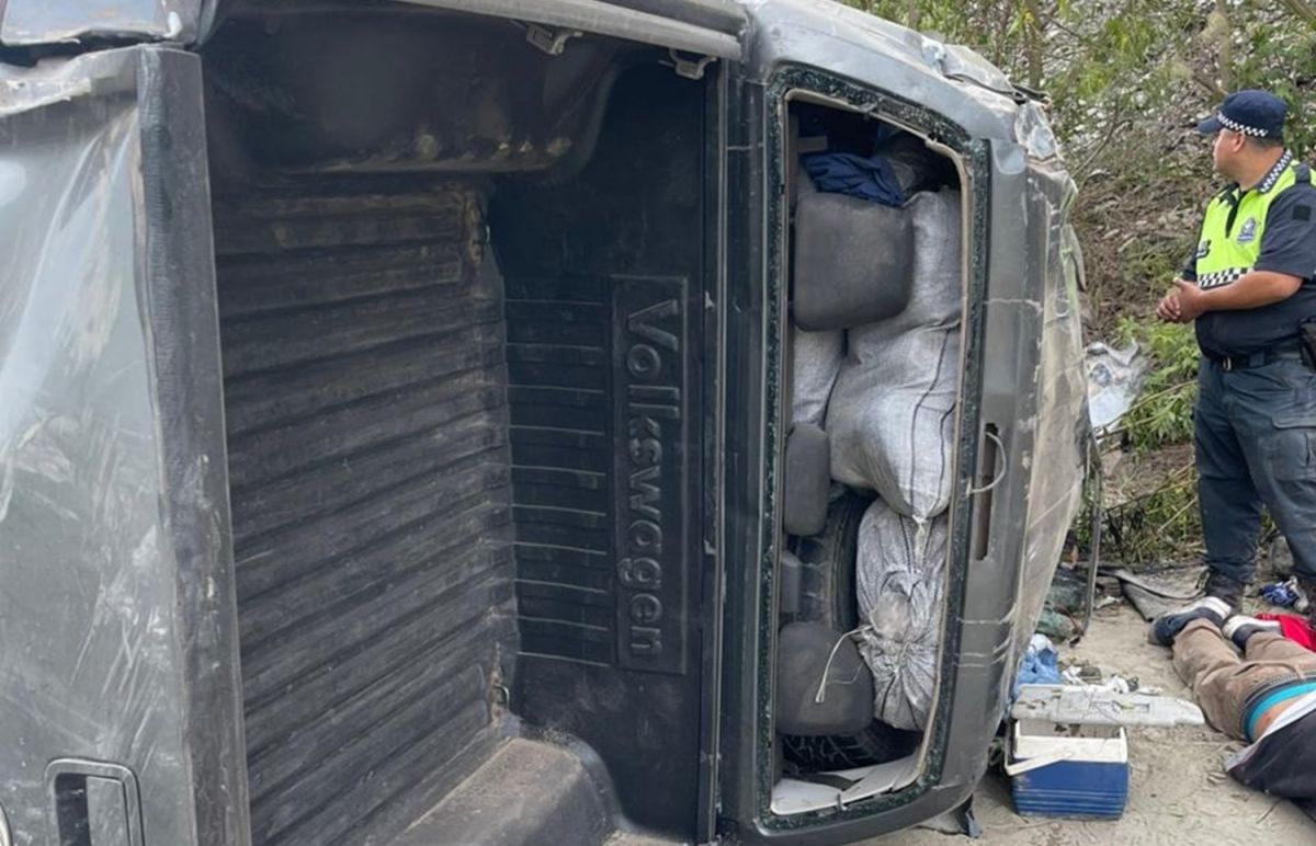 LA CAMIONETA volcó y sus ocupantes resultaron gravemente heridos.