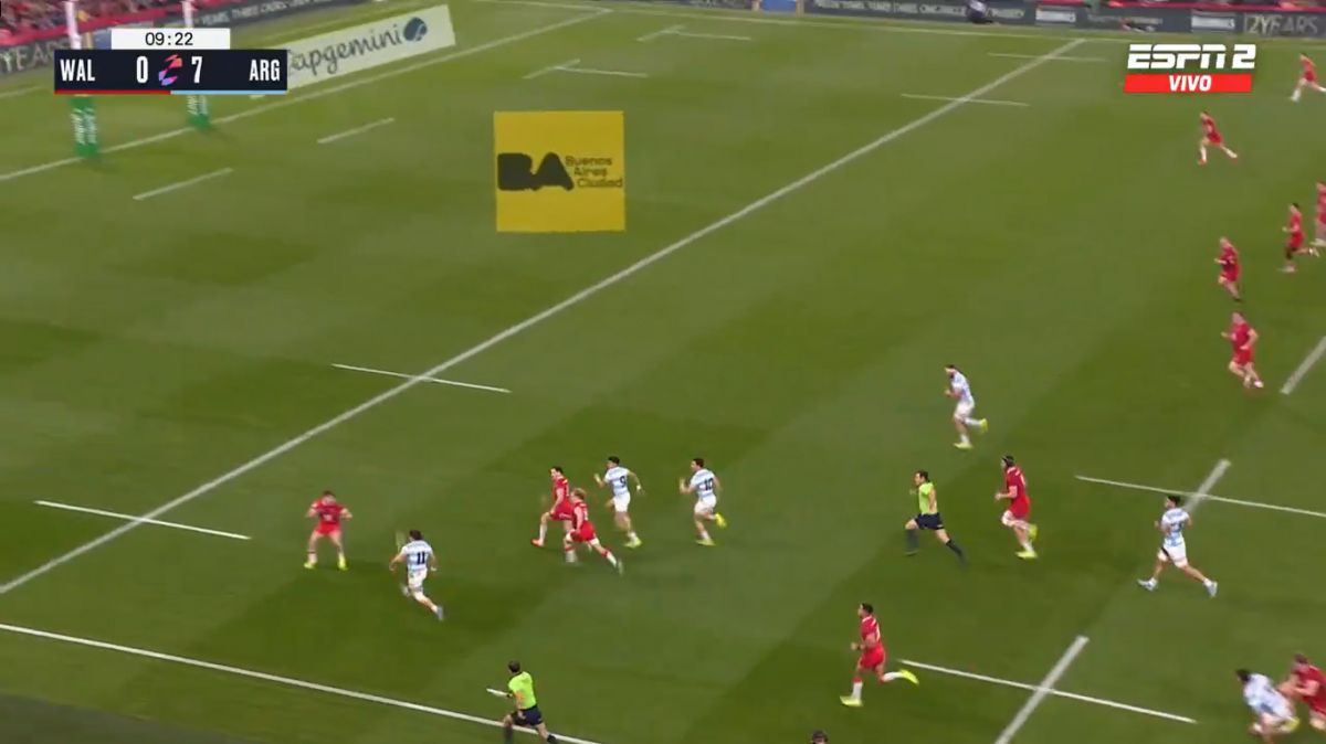 Los Pumas encontraron una joya en medio del combate ante Gales. Desde la izquierda, Mateo Carreras levantó la vista, detectó el hueco detrás de la defensa y ejecutó un kick tan preciso como oportuno. La pelota picó a unos metros de Gerónimo Prisciantelli, que llegó lanzado para capturarla y apoyar el segundo try argentino en Cardiff.
