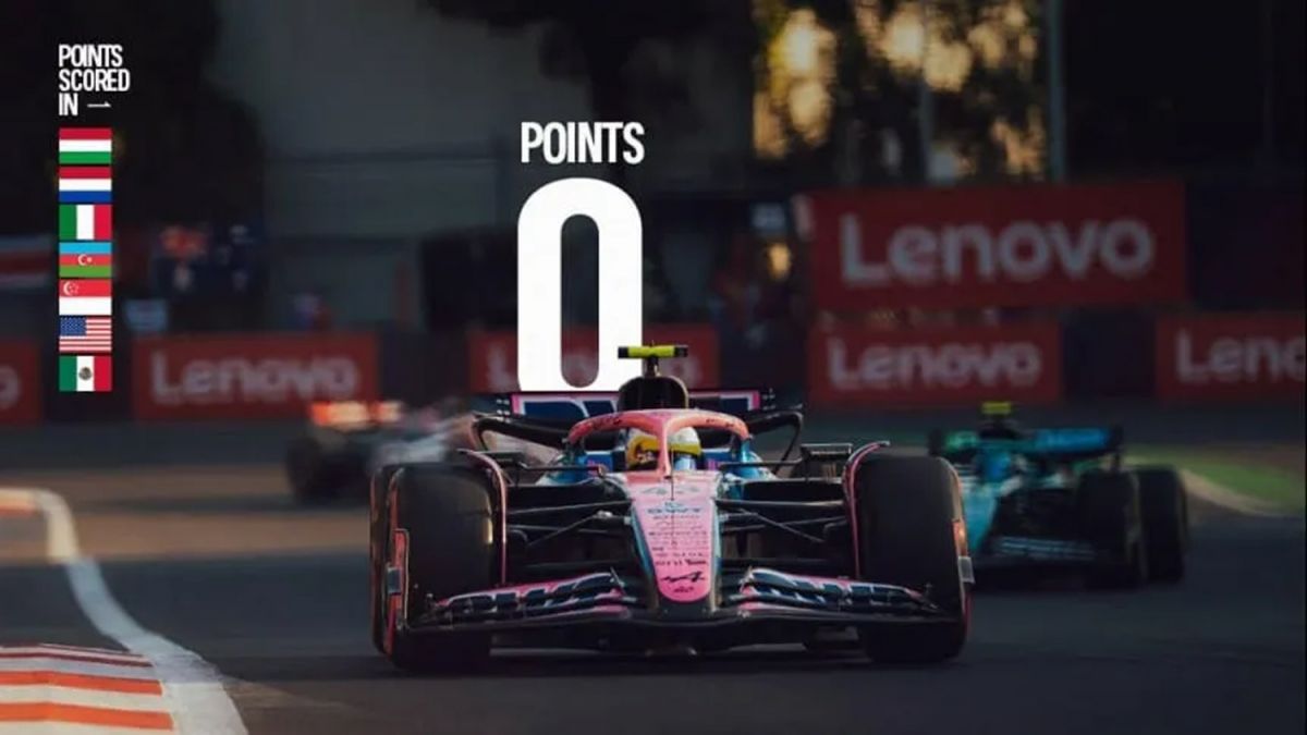 El error comunicacional se profundizó por la utilización del auto de Colapinto para graficar los Grandes Premios sin resultados favorables. A la izquierda, en un tamaño casi imperceptible, figuraba la frase “puntos anotados en” junto a una serie de banderas emoji que representaban esas carreras. La desproporción entre las tipografías -enormes para los números, diminutas para las aclaraciones- reforzó la idea de una comparación directa.