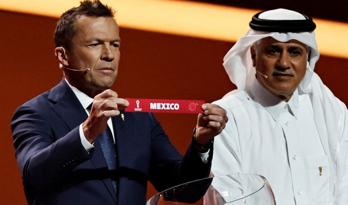 SORTEO. Lothar Matthäus muestra el papel con el nombre de México, en el sorteo de Qatar 2022. En ese torneo, el "Tri" compartió grupo con Argentina, Arabia Saudita y Polonia.