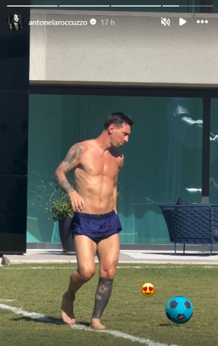 Su esposa Antonela Roccuzzo publicó en sus historias de Instagram un simpático video, donde se puede ver al campeón del mundo con un short azul, pateando una pelota en el jardín de su casa.