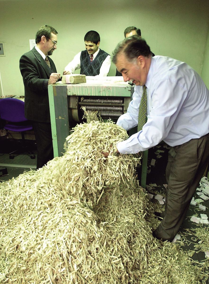 Hubo un tiempo en el que conseguir dinero en efectivo era toda una quimera en Tucumán. Lo que circulaba eran los bonos de cancelación de deuda, los famosos Bocade, fruto de una situación económica que llevó a la provincia a ser una de las primeras que emitió su propia cuasimoneda. Desde 2002 la Nación puso en marcha un plan para eliminar esas cuasimonedas y así terminaron los bonos, despanzurrados por la guillotina instalada en el subsuelo del Banco del Tucumán. La foto es del 27 de julio de ese año, cuando en pocas horas trituraron $ 4 millones de “papeles pintados”.