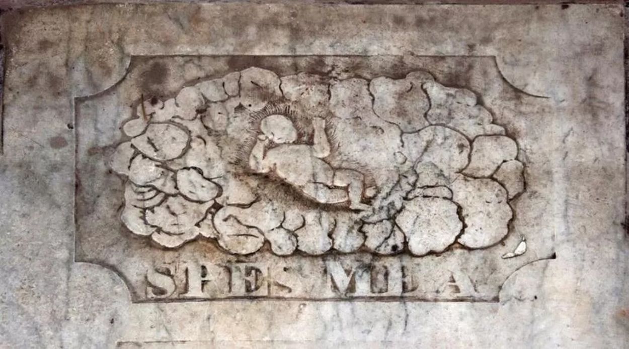 UNA LÁPIDA DETERIORADA. La imagen del Niño Dios indica dónde descansan los restos del obispo José Agustín Molina en la Iglesia de San Francisco.