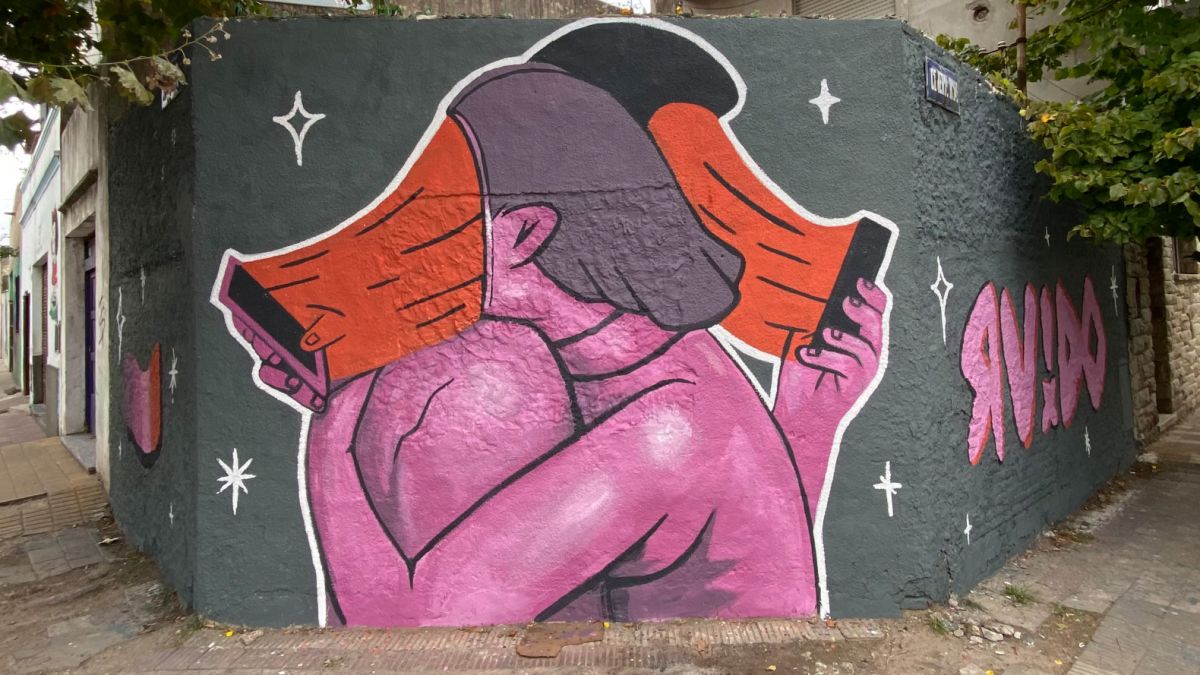 Mural en la isla Maciel, Buenos Aires, perteneciente al grupo Ruido, integrado por Vero Corrales y Fernando Gallucci. De su serie: Relación tóxica con los dispositivos móviles