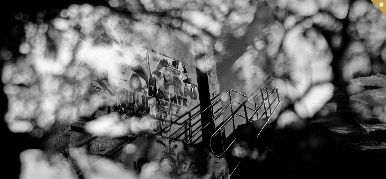 DIFUMINADO. Carteles de candidatos políticos se cuelan por detrás de ramas de árboles, con una escalera que conduce a un destino incierto.