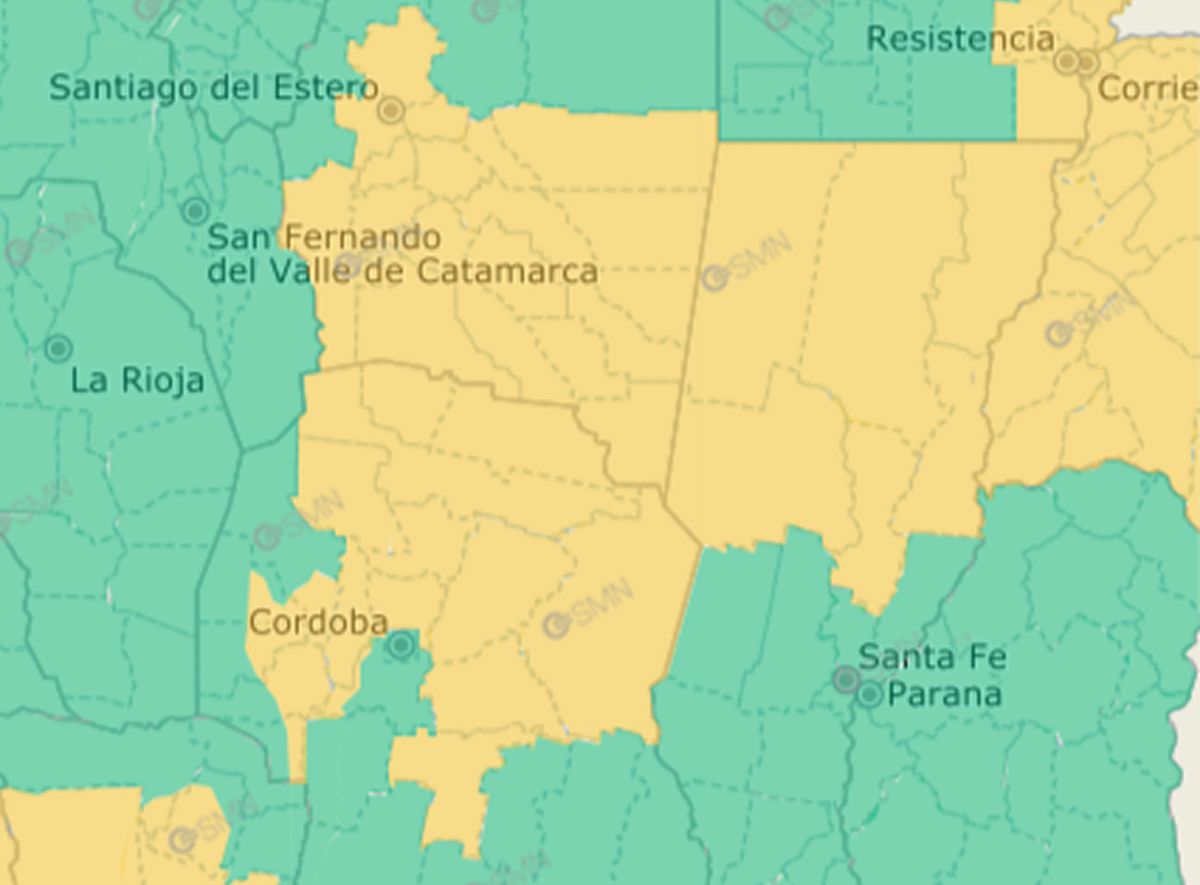 Hacia la región NEA, la parte este de Chaco –en su límite con Corrientes–, gran parte de Corrientes –a excepción de una pequeña zona al noreste– y la mitad norte de Santa Fe están marcadas en amarillo en el mapa del SAT de este lunes. También la mitad norte de Córdoba entró en alerta. Se esperan precipitaciones de las mismas características que en el NOA durante la mañana. En Entre Ríos, estas condiciones se extenderán hasta la noche.