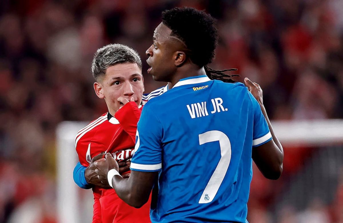 VERSIONES CRUZADAS. Prestianni fue suspendido por la UEFA, tras un supuesto caso de racismo contra el delantero brasileño.