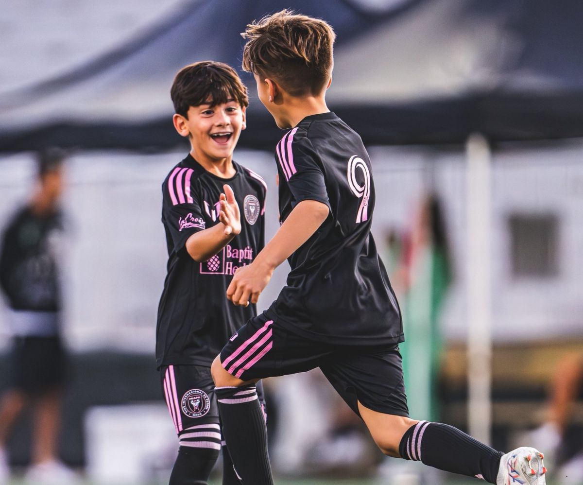NUEVA GENERACIÓN. Ciro Messi y Lautaro Suárez, hijos de Lionel y Luis, emulan a sus padres y celebran uno de sus goles en las infantiles de Inter Miami.