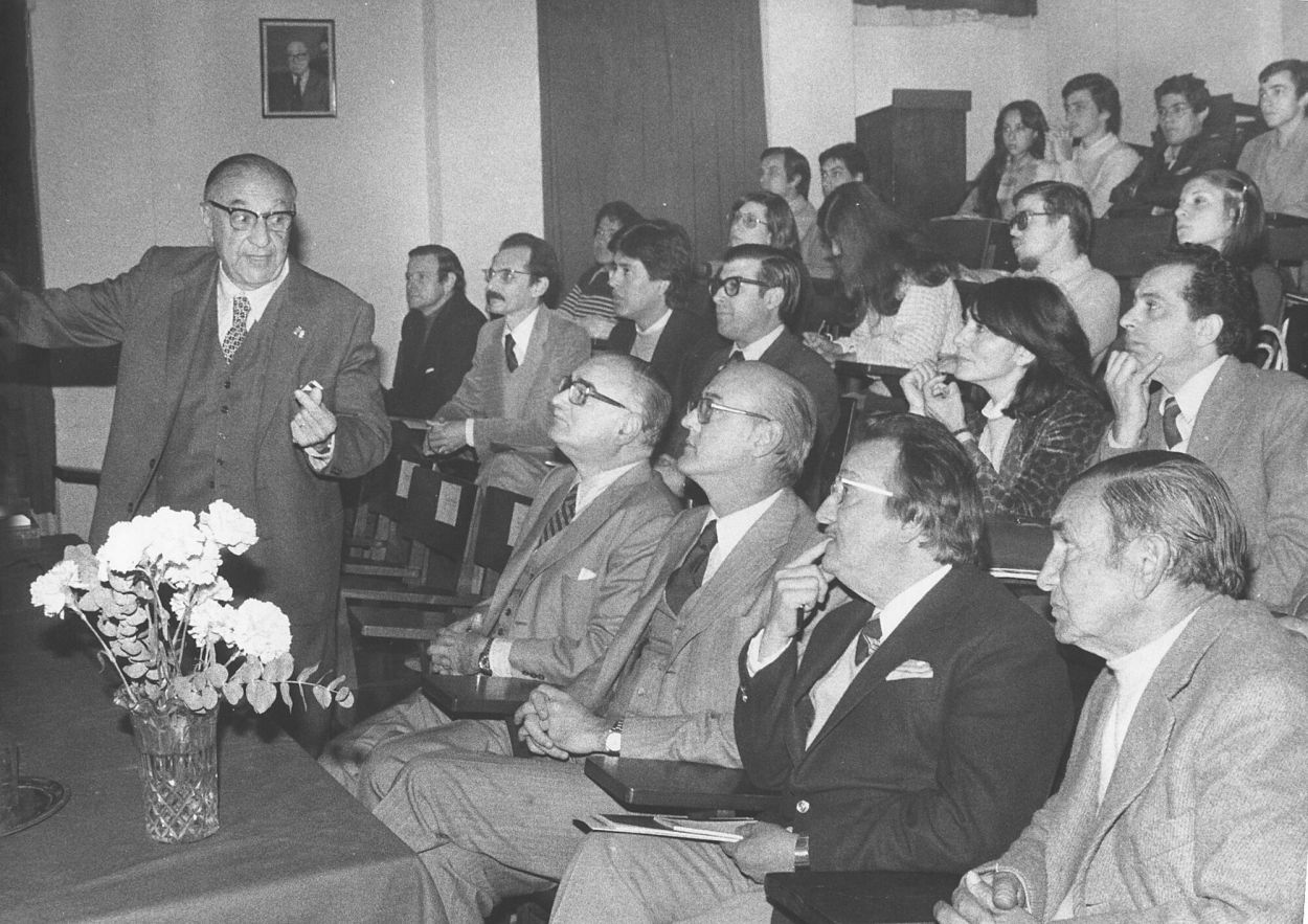 1980. El cardiólogo Pedro Cossio diserta ante profesionales y estudiantes sobre el tratamiento de la angina de pecho en el hospital Padilla.