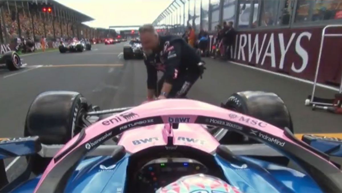 La situación ocurrió instantes antes de la vuelta previa. Un mecánico de Alpine, al interpretar que el monoplaza estaba mal ubicado en su cajón de largada, movió el auto hacia atrás mientras observaba su reloj para verificar el tiempo restante. La maniobra se realizó a pocos segundos del inicio del procedimiento de partida y frente a un comisario de la Federación Internacional del Automóvil (FIA), que se encontraba junto al muro de boxes.
