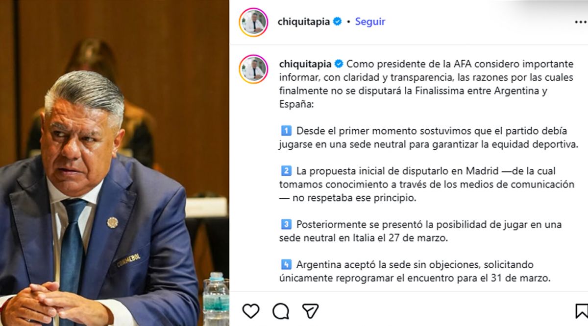 Claudio “Chiqui” Tapia utilizó sus redes sociales para explicar los motivos por los cuales finalmente no se disputará la Finalissima entre Argentina y España. El presidente de la Asociación del Fútbol Argentino (AFA) publicó un mensaje en el que detalló cómo se desarrollaron las negociaciones y remarcó que desde el primer momento la postura argentina fue jugar el partido en una sede neutral.