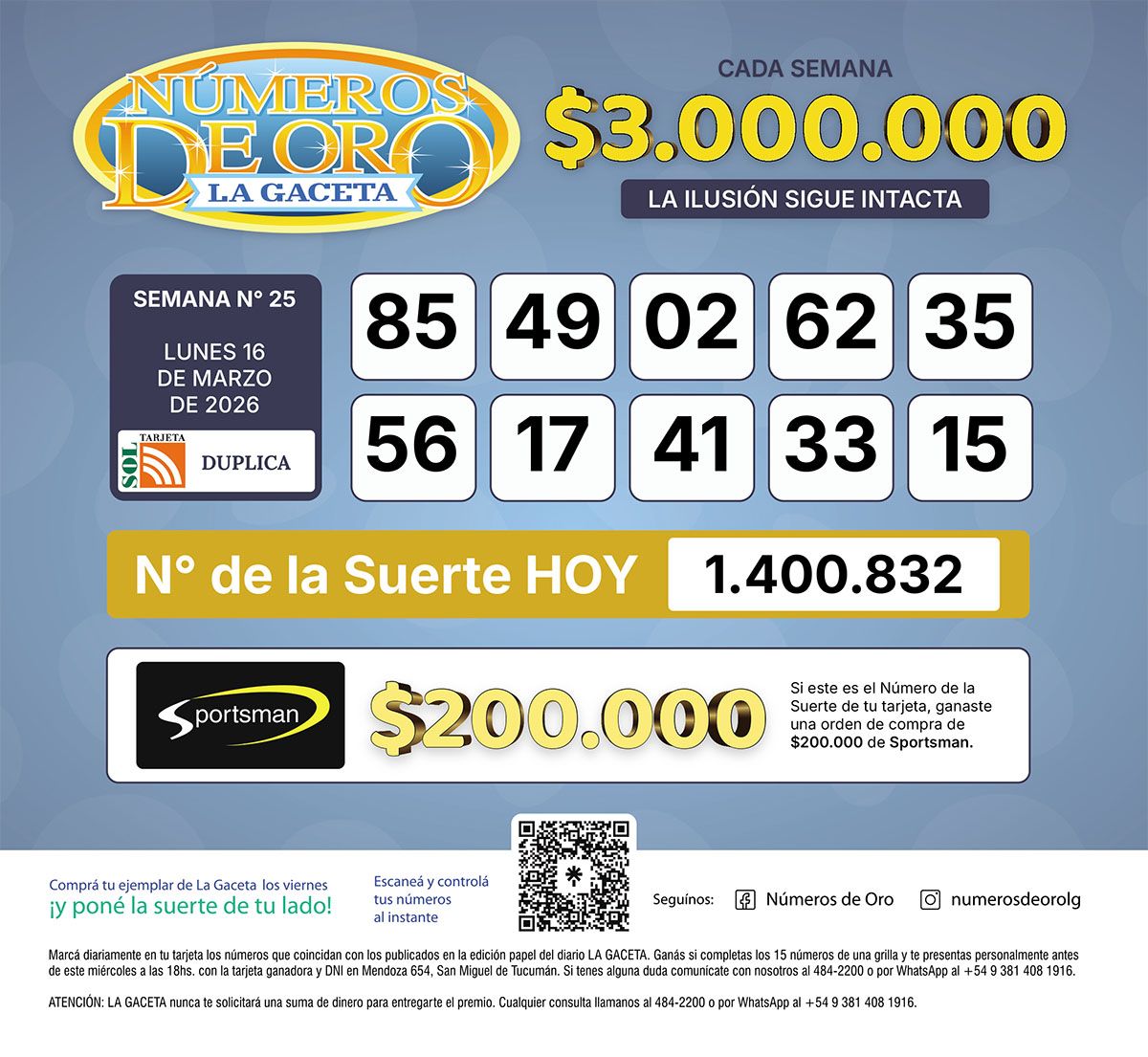 Los Números de Oro de LA GACETA del 16 de marzo de 2026