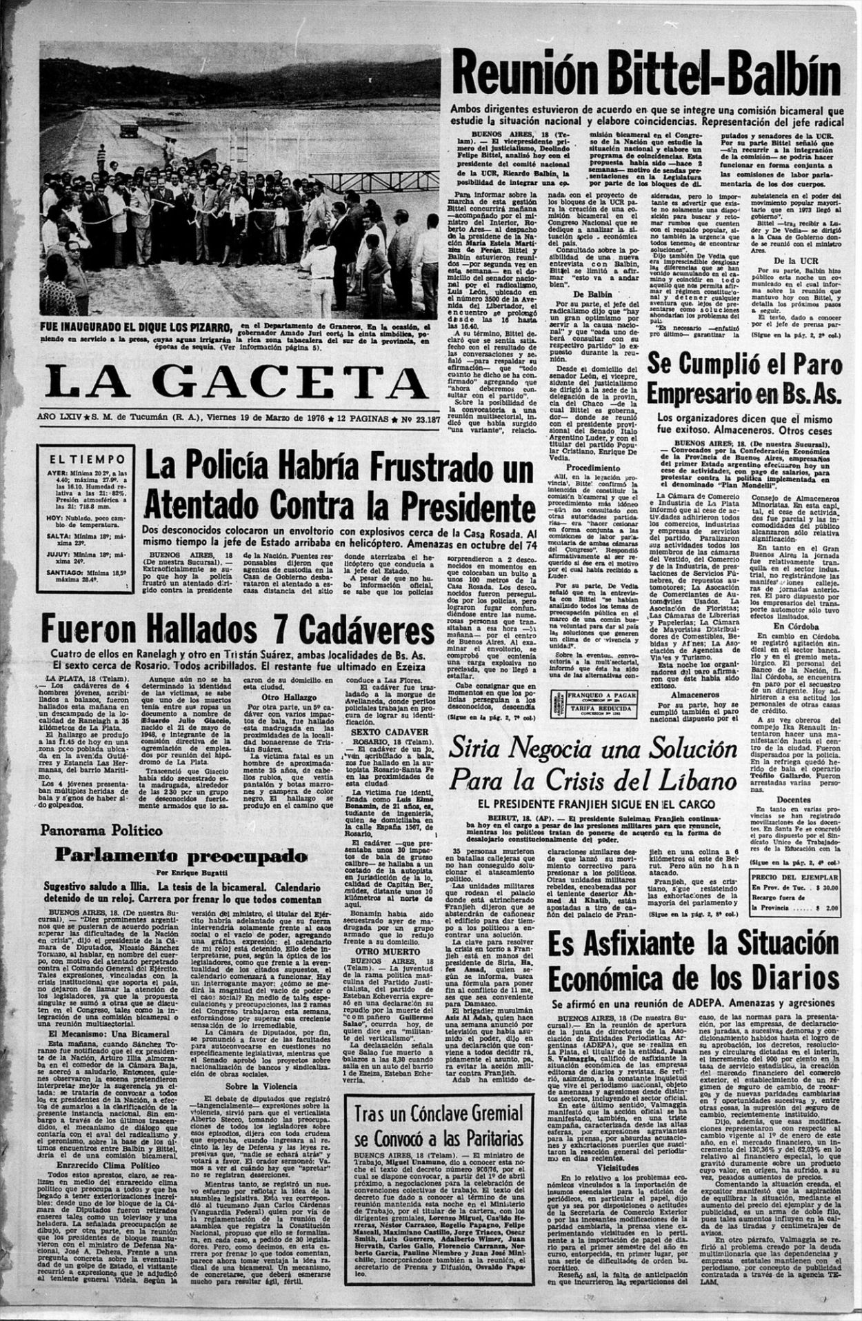 LA GACETA DEL DÍA SIGUIENTE. Temas claves: la reunión Bittel-Balbín y el atentado frustrado. La imagen: inauguraban Los Pizarro.
