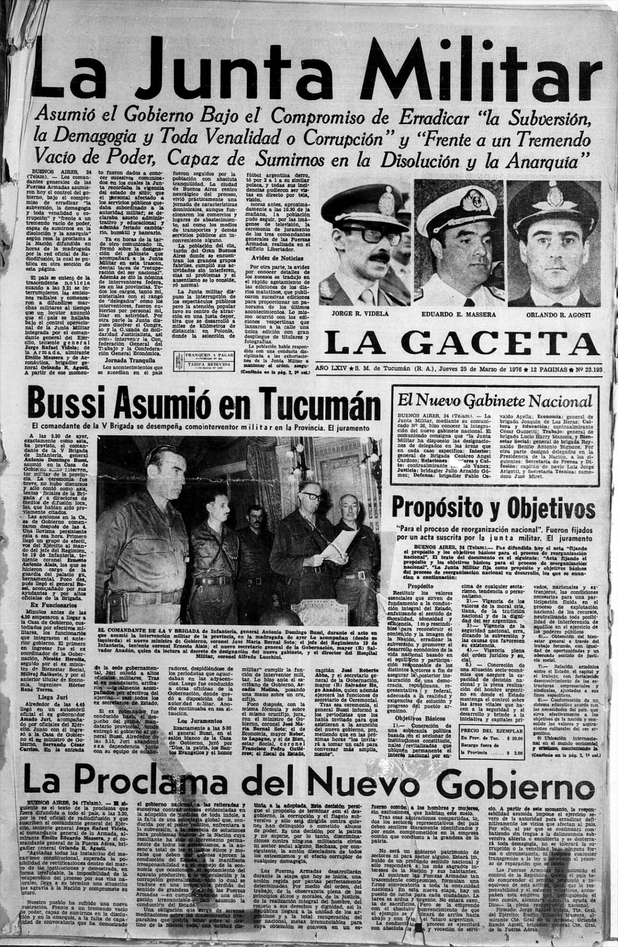 Las primeras horas del golpe le sirvieron a la flamante dictadura para presentarle al país los postulados del autodenominado Proceso de Reorganización Nacional. A las 3.21 las radios empezaron a transmitir marchas militares, sólo interrumpidas por la voz de un locutor que anunciaba que la Argentina se encontraba bajo el “control operacional” de una Junta integrada por los jefes de las tres Armas: Jorge Rafael Videla (Ejército), Emilio Massera (Marina) y Orlando Agosti (Fuerza Aérea).