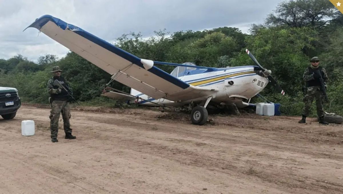 BAJO INVESTIGACIÓN. Gendarmes custodian la avioneta que aterrizó en el paraje San José del Boquerón, Santiago del Estero.
