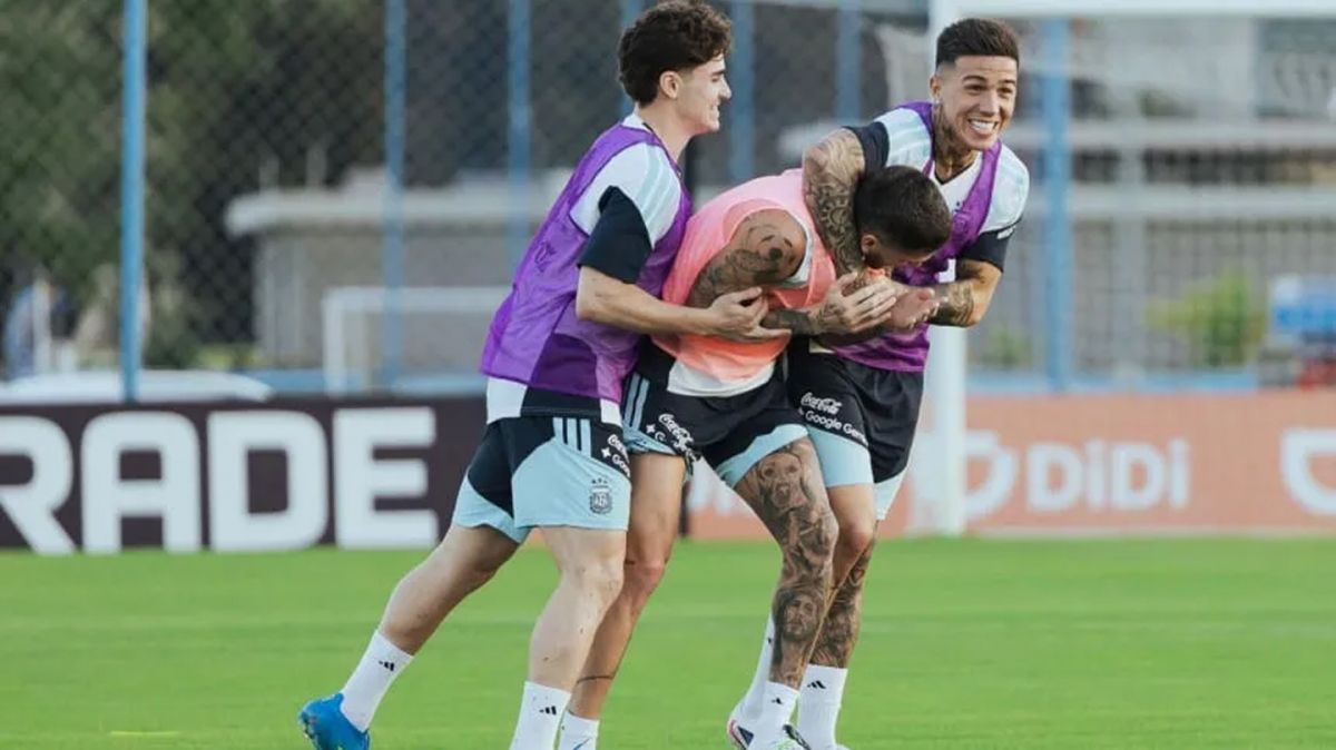 CLIMA DISTENDIDO. Enzo Fernández, Rodrigo de Paul y Julián Álvarez durante una de las prácticas previas al amistoso frente a Mauritania. Foto de @Argentina.