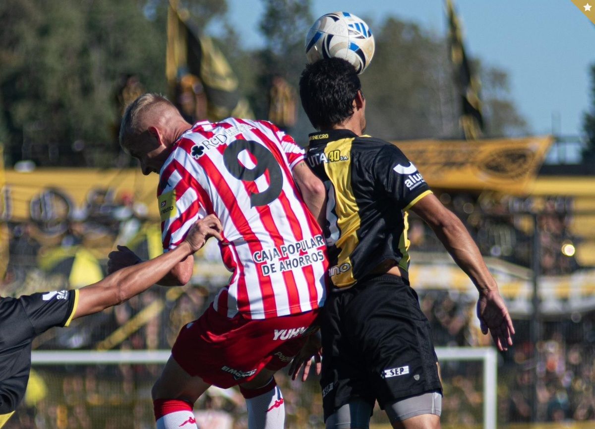 POR LOS AIRES. Diellos disputa una dividida con Marcelo Meli durante el empate entre San Martín y Deportivo Madryn. Foto CASM.