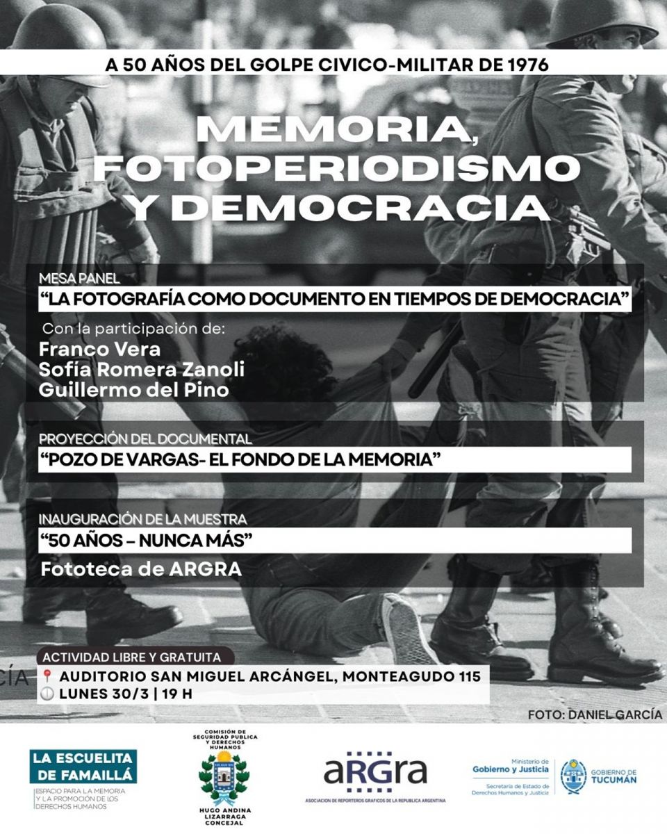 Tucumán recordará los 50 años del golpe de 1976 con la jornada “Memoria, Fotoperiodismo y Democracia” el 30 de marzo en el Auditorio San Miguel Arcángel para reflexionar sobre la historia.
