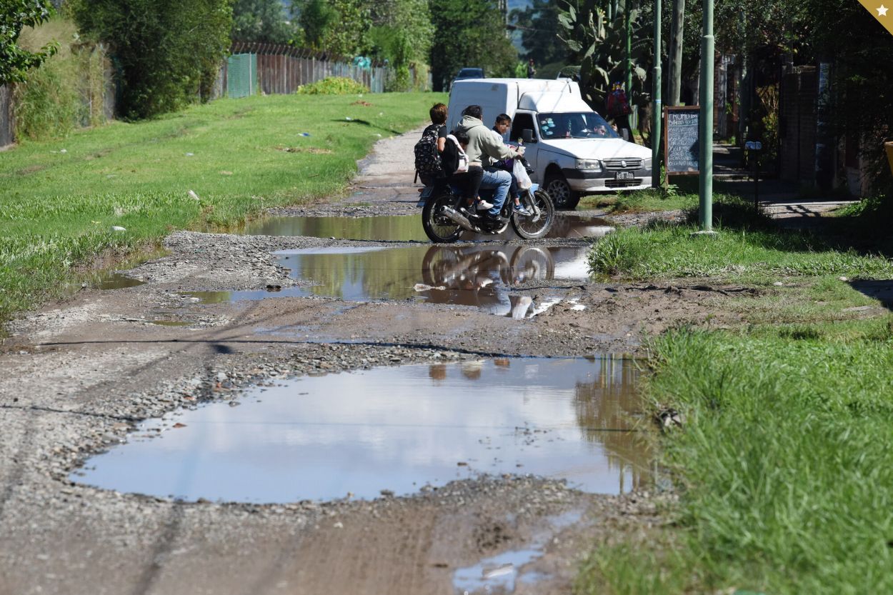 SINUOSO. Los motociclistas esquivan el agua estancada en calle Venecia; los autos evitan pasar por allí. La Gaceta / Fotos de Analía Jaramillo