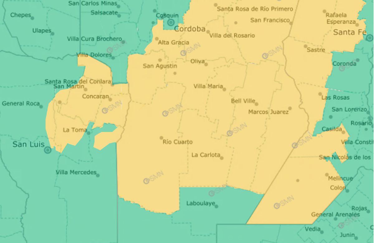 En el centro-oeste y sudoeste de Córdoba se esperan tormentas con actividad eléctrica esta tarde, ráfagas de hasta 70 kilómetros por hora y valores de precipitación acumulada entre 30 y 60 milímetros. Serán afectadas las regiones de Juárez Celman, Río Cuarto, San Martín, Marcos Juárez, Unión, Calamuchita y Santa María. San Justo, al noreste de la provincia, en cambio, tendrá tormentas de similares características por la noche del sábado.