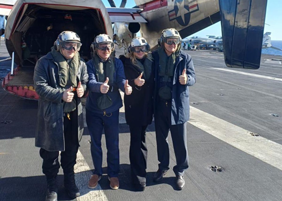 Milei y su comitiva, en el portaviones estadounidense. FOTO X DEFENSA
