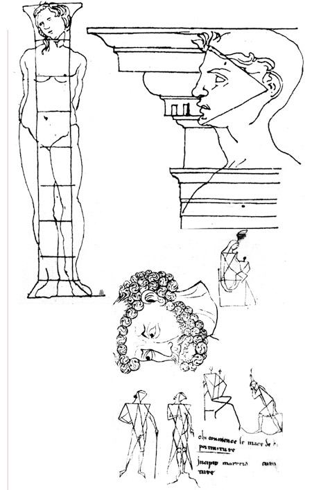 Diseños de Villard de Honnecourt (siglo XII) y de Fra Giocondo (siglo XV) sobre el hombre y la geometría, y el hombre y la arquitectura .