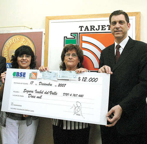AL COBRAR. Isabel Segura, entre María Galván, gerente de Tarjeta Sol, y Gustavo Neme, del Banco de Santiago. LA GACETA / JORGE OLMOS SGROSSO