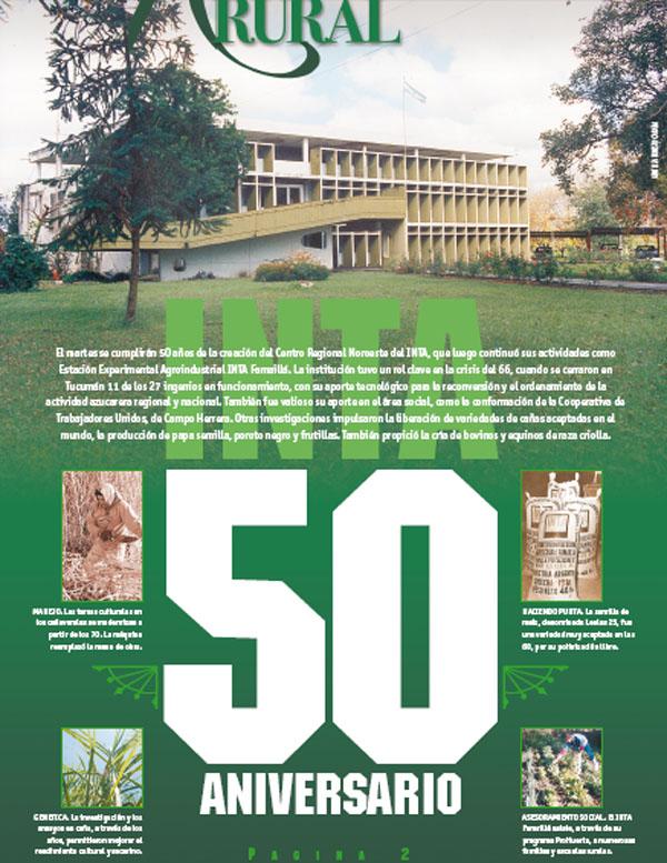 El martes se cumplirán 50 años de la creación del Centro Regional Noroeste del INTA, que luego continuó sus actividades como Estación Experimental Agroindustrial INTA Famaillá. La institución tuvo un rol clave en la crisis del 66, cuando se cerraron en Tucumán 11 de los 27 ingenios en funcionamiento, con su aporte tecnológico para la reconversión y el ordenamiento de la actividad azucarera regional y nacional. También fue valioso su aporte en el área social, como la conformación de la Cooperativa de Trabajadores Unidos, de Campo Herrera. Otras investigaciones impulsaron la liberación de variedades de cañas aceptadas en el mundo, la producción de papa semilla, poroto negro y frutillas. También propició la cría de bovinos y equinos de raza criolla.