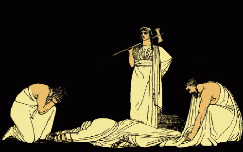 EL NUDO. La imagen ilustra el asesinato de Agamenón, envenado por su esposa Clitemnestra (amante de Egisto), a quien luego matará su hijo, Orestes.