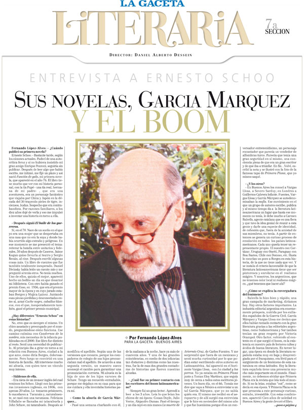 - Siempre fui un gran lector. Aprendí a leer a los 3 años. Leía lo que leían los chicos de mi época: Conan Doyle, Julio Verne, Alejandro Dumas. Pasó el tiempo y un día cayó en mis manos La muerte de Artermio Cruz, de Carlos Fuentes. Y me sorprendió que fuera de un mexicano y sentí mucha curiosidad por lo que podían estar escribiendo otros autores en Latinoamérica. Así apareció en el horizonte Vargas Llosa, con La ciudad y los perros. Yo ya estaba en Primera Plana junto a Tomas Eloy Martínez, que seguía muy de cerca a todos estos escritores jóvenes. Un buen día, en el 66, Tomás me dice que vaya a México a entrevistar a un tal García Márquez, que yo no sabía quién era. El mismo me recibió en el aeropuerto y de allí surgió esa entrevista que le hice en noviembre del mismo año y que fue buenísima porque él es un conversador entretenidísimo, un personaje encantador que parecía un vendedor de alfombras turco. Parecía que tenia una gran seguridad en sí mismo, una conciencia plena de que era un gran escritor y de que iba a triunfar. En fin?Volví, escribí la nota y se ilustró con la foto de la famosa tapa de Primera Plana, que yo mismo saqué.