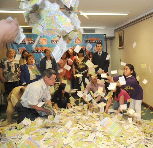 EL SORTEO. Lectores arrojaron las tarjetas al aire y Paula Alvarez (a la derecha) atrapó el cartón ganador. LA GACETA/ JUAN PABLO SANCHEZ NOLI