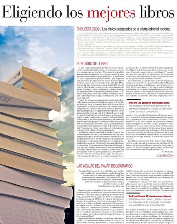 Al igual que el año pasado, les pedimos a nuestros colaboradores que eligieran los mejores libros que habían leído entre los publicados en los últimos 12 meses, y que consignaran un título de un autor nacional y otro de un autor extranjero. En 2008, la novela La muerte lenta de Luciana B., de Guillermo Martínez, fue el libro argentino que recibió la mayor cantidad de votos, seguido por La libertadora (María Sáenz Quesada) y El enigma de París (Pablo de Santis). Entre los extranjeros ocupó el primer lugar Un día de cólera, de Arturo Pérez Reverte, seguido por dos novelas de Sándor Márai (El último encuentro y La hermana).