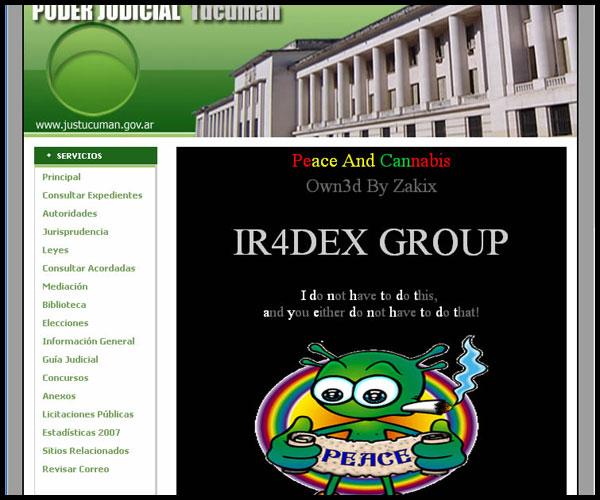 La página web del Poder Judicial de Tucumán fue hackeada por piratas informáticos. Esta mañana, la portada apareció completamente en blanco y sólo podía leerse "Spiral", la identificación de un atacante. A los pocos minutos, lograron reestablecerla. Pero no duró mucho, ya que luego volvió a ser atacada. En esta oportunidad, pudo observarse la ilustración de una criatura verde acompañada por la firma de otro hacker, "Ir4dex Group".
