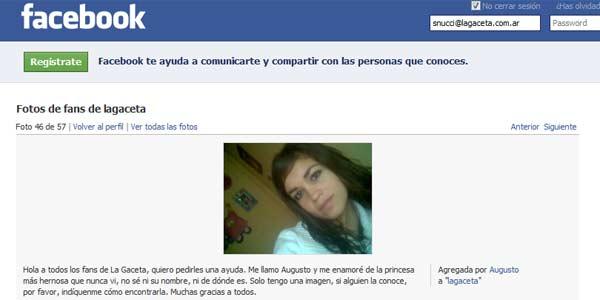 TEXTUAL. "Hola a todos los fans de La Gaceta, quiero pedirles una ayuda. Me llamo Augusto y me enamoré de la princesa más hernosa que nunca vi, no sé ni su nombre, ni de dónde es. Solo tengo una imagen, si alguien la conoce, por favor, indíquenme cómo encontrarla. Muchas gracias a todos". Ese comentario escribió Augusto al pie de la foto subida en setiembre pasado. LA GACETA