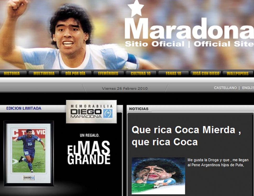 BUENOS AIRES.- La página web oficial del entrenador de la Selección argentina, Diego Maradona, fue hackeada esta mañana por piratas informáticos. En un espacio denominado "Noticias", podía verse una caricatura del astro consumiendo droga, acompañada del título "Qué rica coca". Al mediodía, el sitio fue reestablecido.