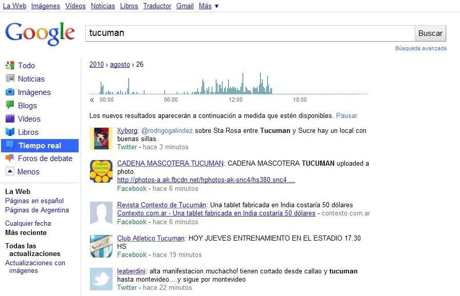 La modalidad es simple, solo basta escribir lo que se desea hallar, se selecciona la pestaña "Tiempo Real", y comenzarán a aparecer una serie de resultados basados en información publicada en Twitter, Facebook, Buzz, Orkut, Blogger, WordPress, entre otros.