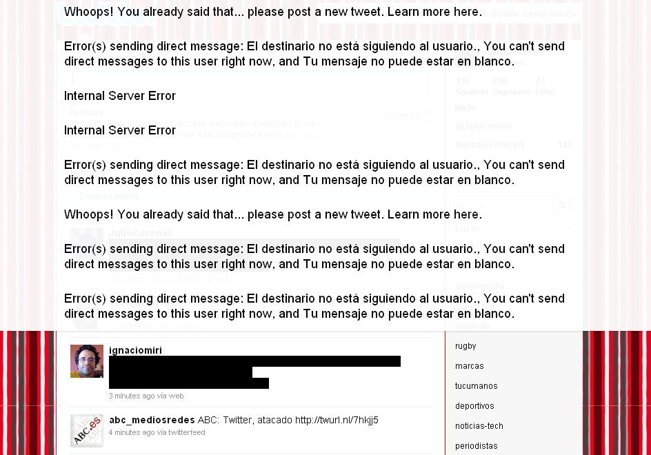 El problema generó que muchos usuarios enviaran involuntariamente tweets ocultos bajo barras de colores y links que, al paso del mouse, desplegaban páginas pop-ups con contenido pornográfico. Desde Twitter solicitaron enviar mensajes a la cuenta oficial del sitio si se tiene información sobre el ataque. LA GACETA ©