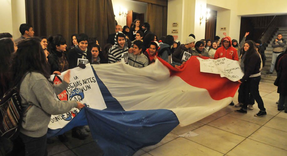 "Queremos estudiar", "Cerisola entregá el edificio". Al ritmo de batucadas y saltando en ronda, una treintena de alumnos de la Escuela de Bellas Artes irrumpió en el hall central del Teatro Alberdi, mientras daba comienzo el concierto de la Orquesta Sinfónica, en el marco del lanzamiento del Julio Cultural.