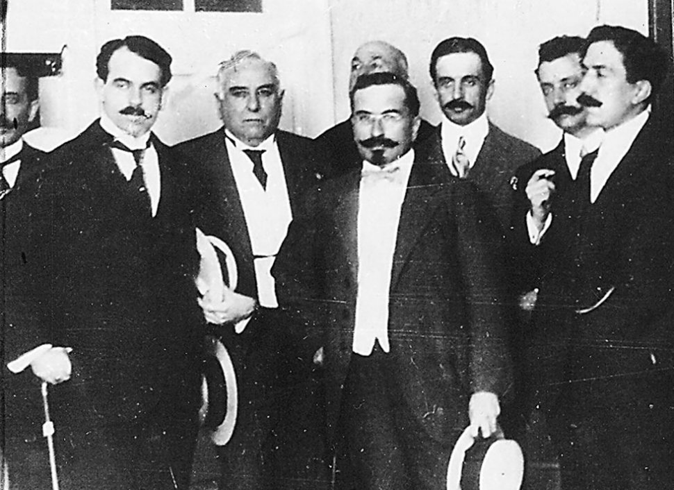 EN BUENOS AIRES, 1912. Desde la izquierda, en primera fila, Manuel A. Montes de Oca, el ministro Adolfo Mujica y el director de la Defensa Agrícola, Julio López Mañán.