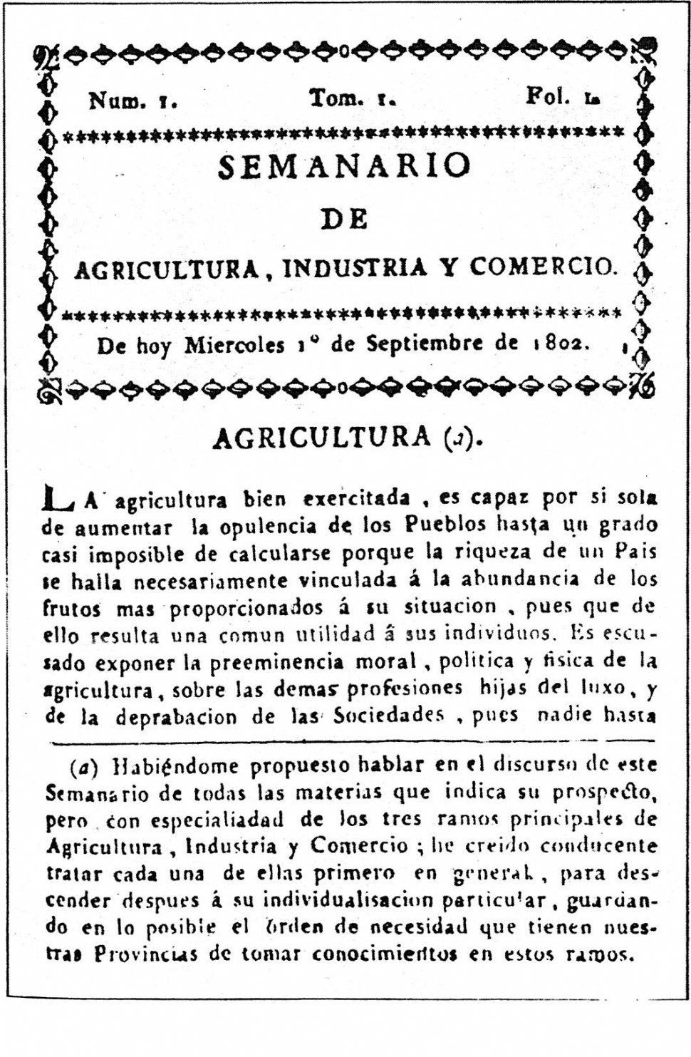 EL PERIÓDICO. Portada del número inicial del "Semanario", que apareció en 1802. LA GACETA / ARCHIVO