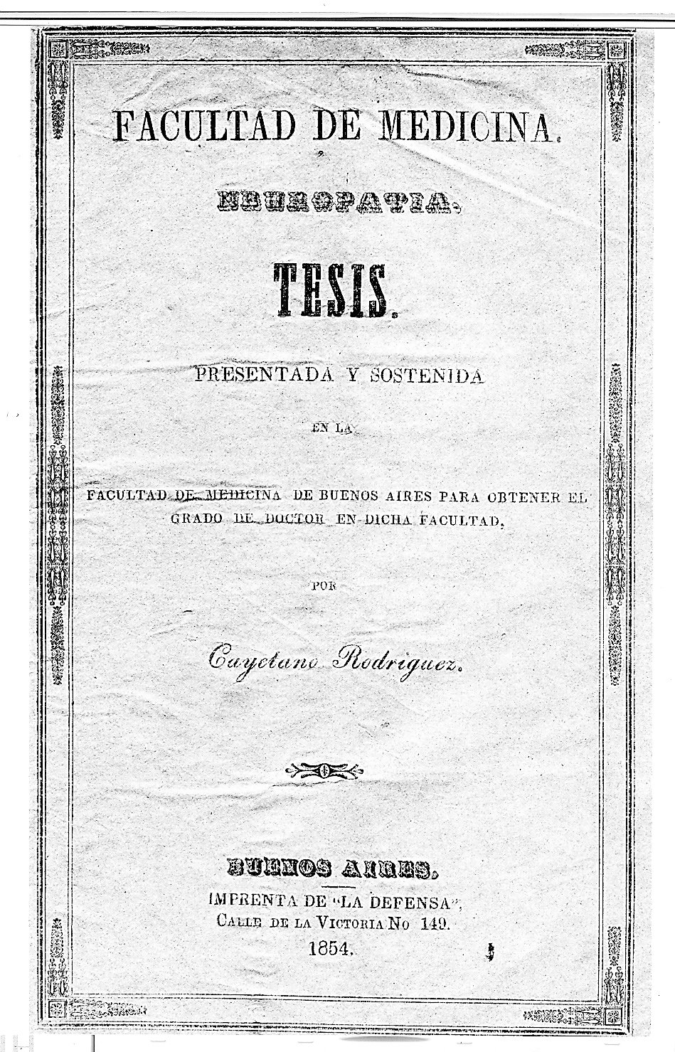 El doctor Cayetano Rodríguez fue un médico tucumano que nació en 1826 y falleció prematuramente en 1859. Se doctoró en la Facultad de Medicina de la Universidad de Buenos Aires en 1854, con la tesis "Neuropatías", que editó ese año. Pensamos que el tema era novedoso para la época, y que los estudiosos podrían examinar sus disquisiciones con provecho.