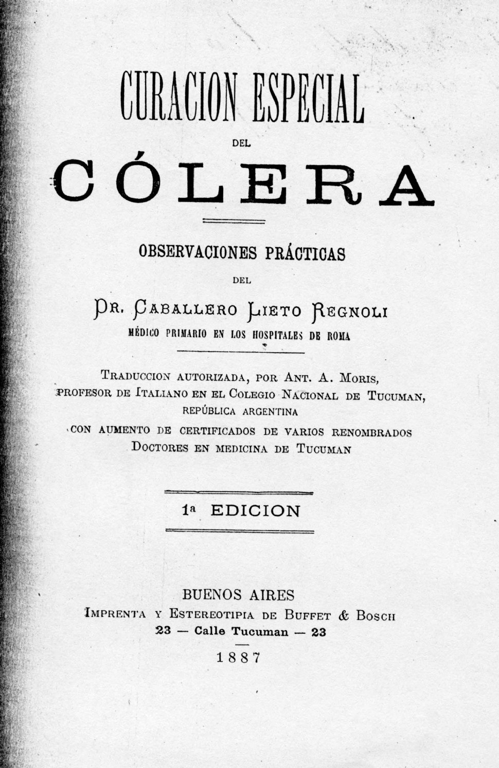 Interesa consignar el caso del folleto "Curación especial del cólera. Observaciones prácticas", obra del doctor y "cavalieri" Lieto Regnoli, médico en los hospitales de Roma. Esto, porque se imprimió en "traducción autorizada, por Antonio A. Moris, profesor de Italiano en el Colegio Nacional de Tucumán, República Argentina". La edición, hecha en Buenos Aires, iba aumentada con "certificados de varios renombrados Doctores en Medicina de Tucumán".