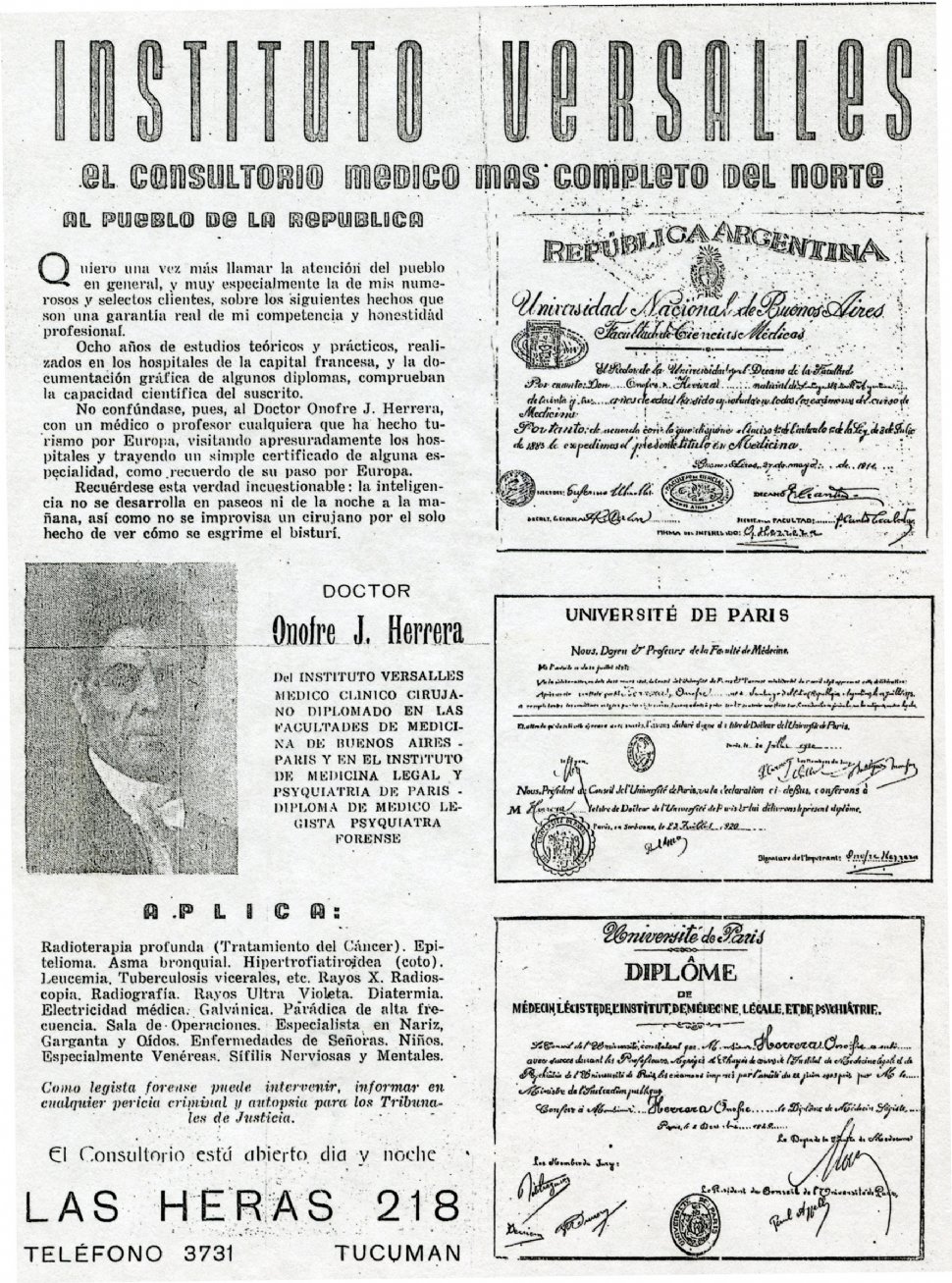El doctor Onofre J. Herrera actuó en la medicina de Tucumán durante la primera mitad del siglo que pasó. Lo singularizó la curiosa propaganda que daba a su "Instituto Versalles", que instaló en la importante casa de Las Heras (hoy San Martín) 218, pegada a la Comisaría Primera.