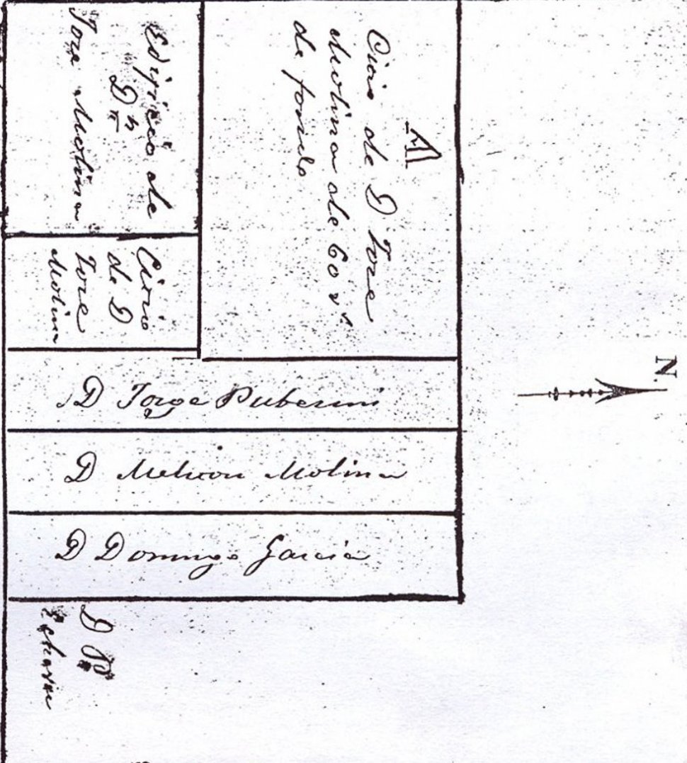 JOSE AGUSTÍN MOLINA. La casa del obispo, en la ochava noreste de 24 de Setiembre y Maipú, con los dos sitios linderos también de su propiedad, en un plano de 1857. LA GACETA / ARCHIVO