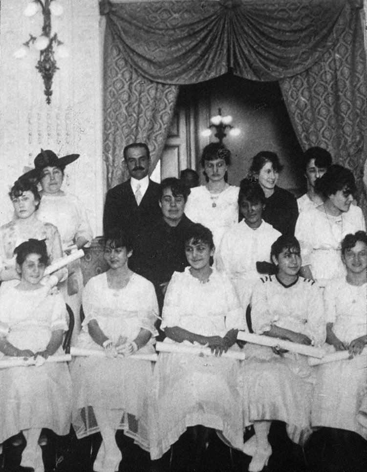 FLAMANTES MAESTRAS. El rector de la Universidad, doctor Juan B. Terán, posa junto a las docentes en un acto en la Casa de Gobierno, hacia 1915. LA GACETA / ARCHIVO